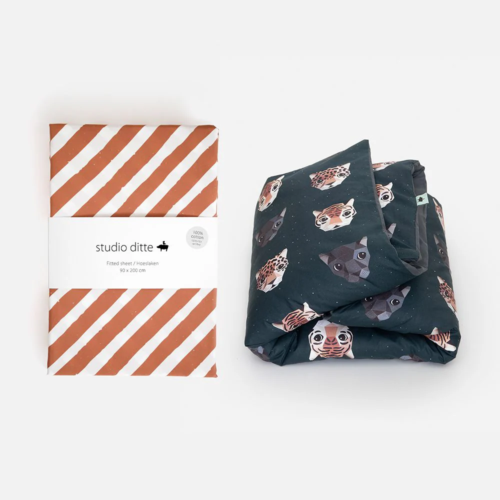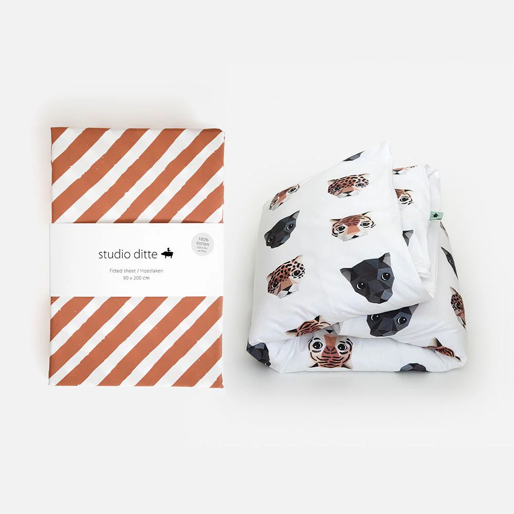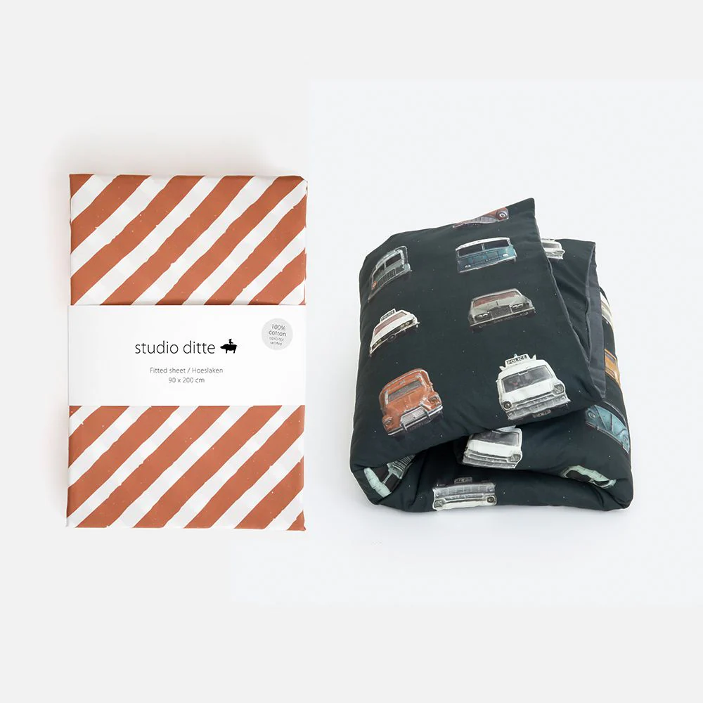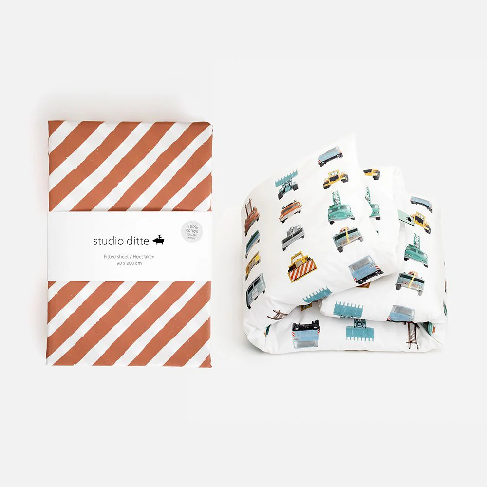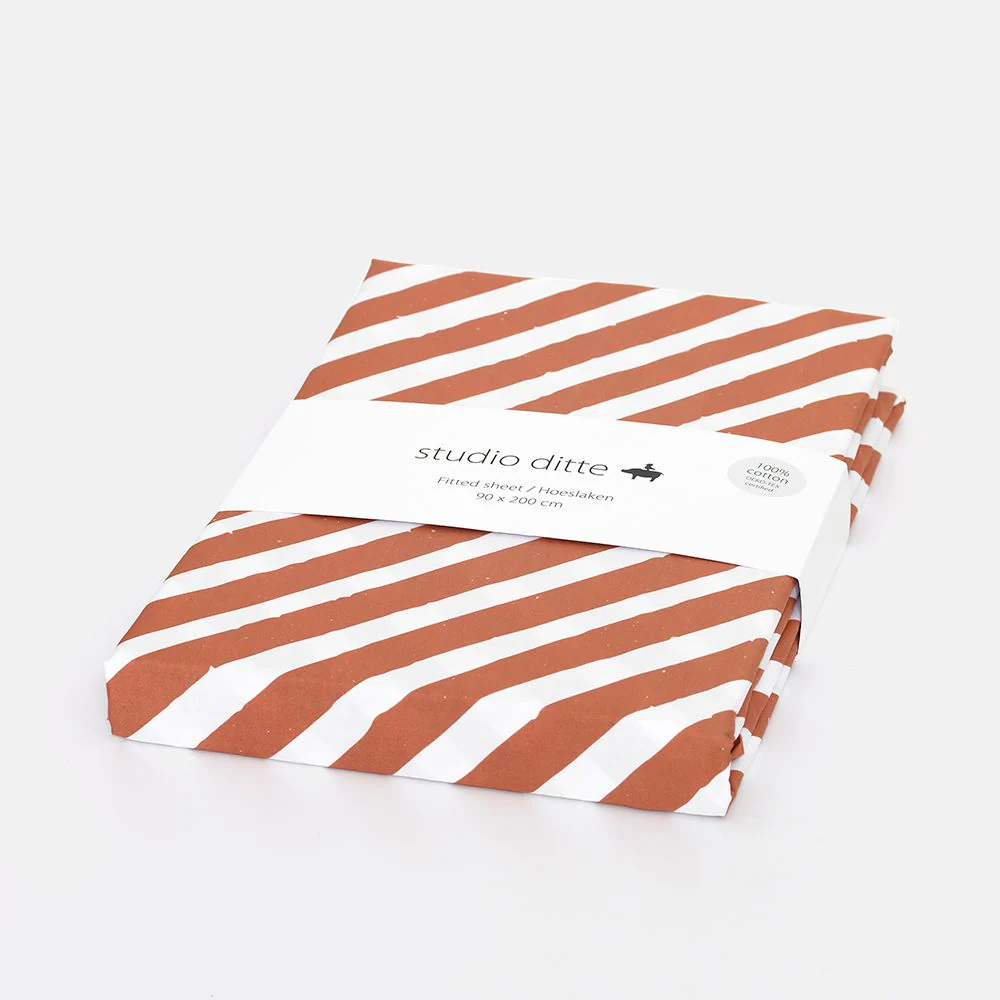 Studio Ditte junior hoeslaken met roestbruine diagonale strepen. Perfect te combineren met verschillende dekbedovertrekken van Studio Ditte. Elastiek in de hoeken zorgt ervoor dat de hoes mooi aansluit op het matras.