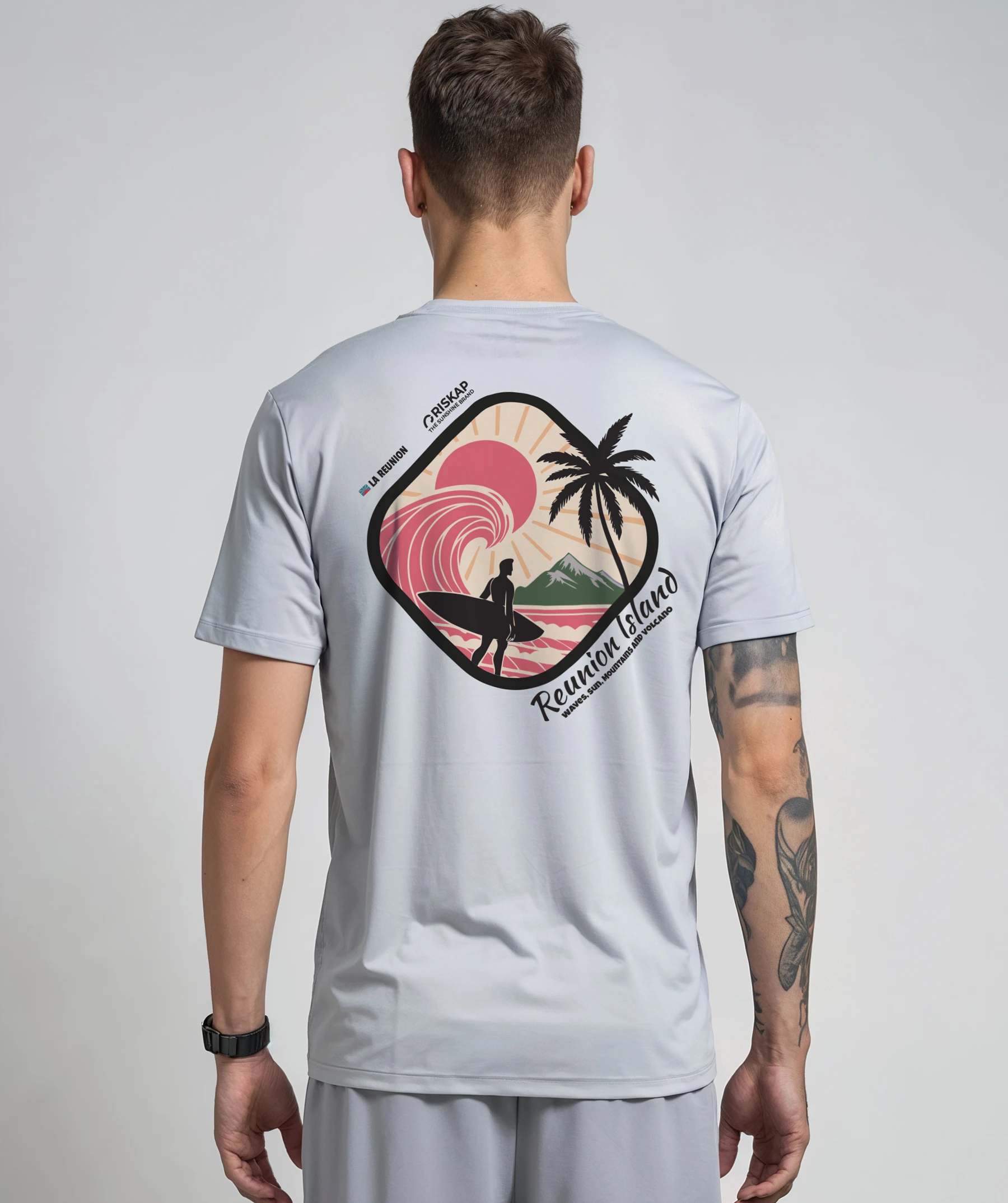 - Design : Illustration vibrante de l’Île de la Réunion avec silhouette de surfeur