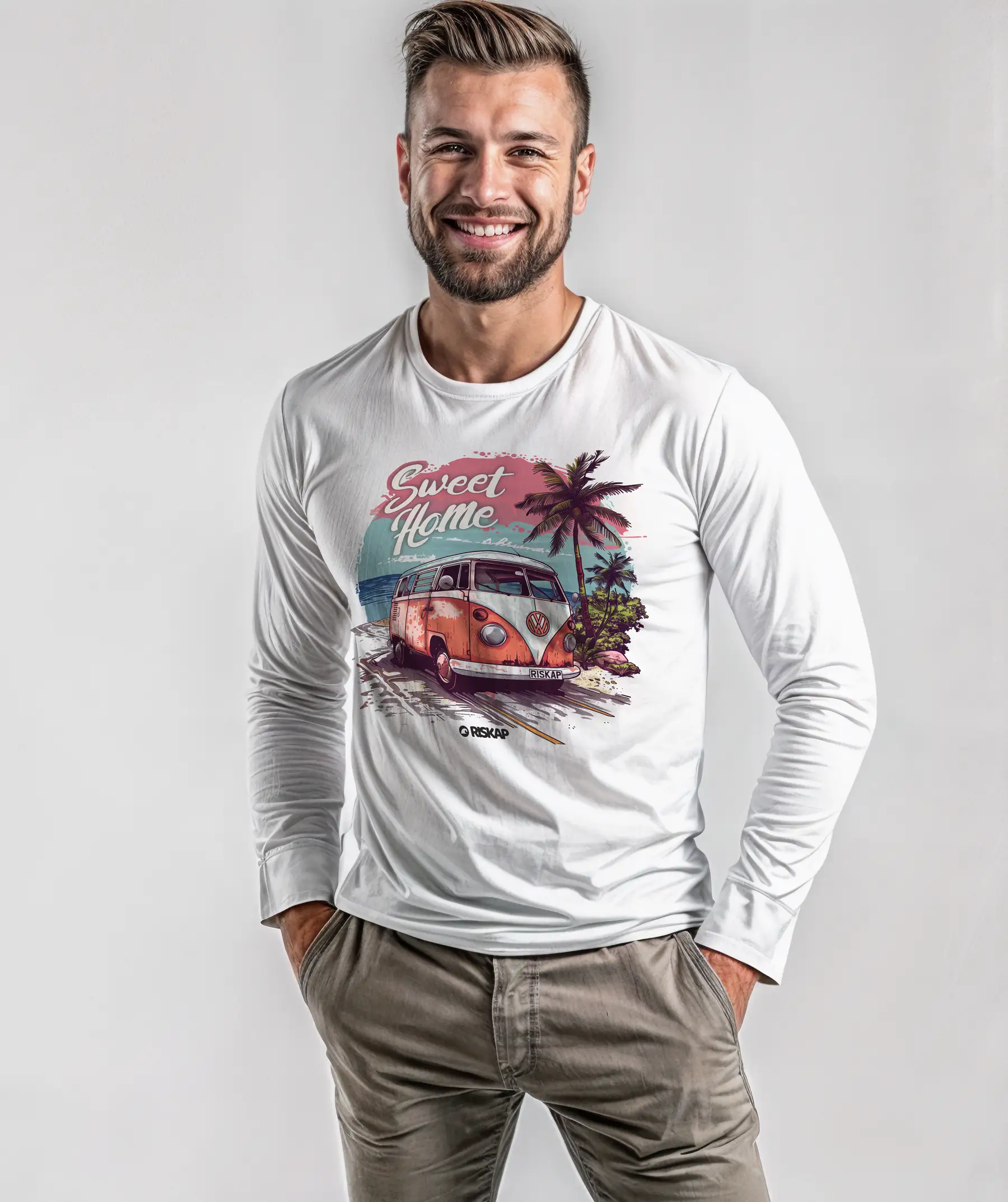 T-shirt Homme Manches Longues – Sweet Home – Découvrez le t-shirt « Sweet Home » pour homme, où aventure et nature se rencontrent. Emportez l’esprit du voyage et la liberté des grands espaces avec vous, grâce à ce design emblématique d’un minibus vintage devant un décor tropical.