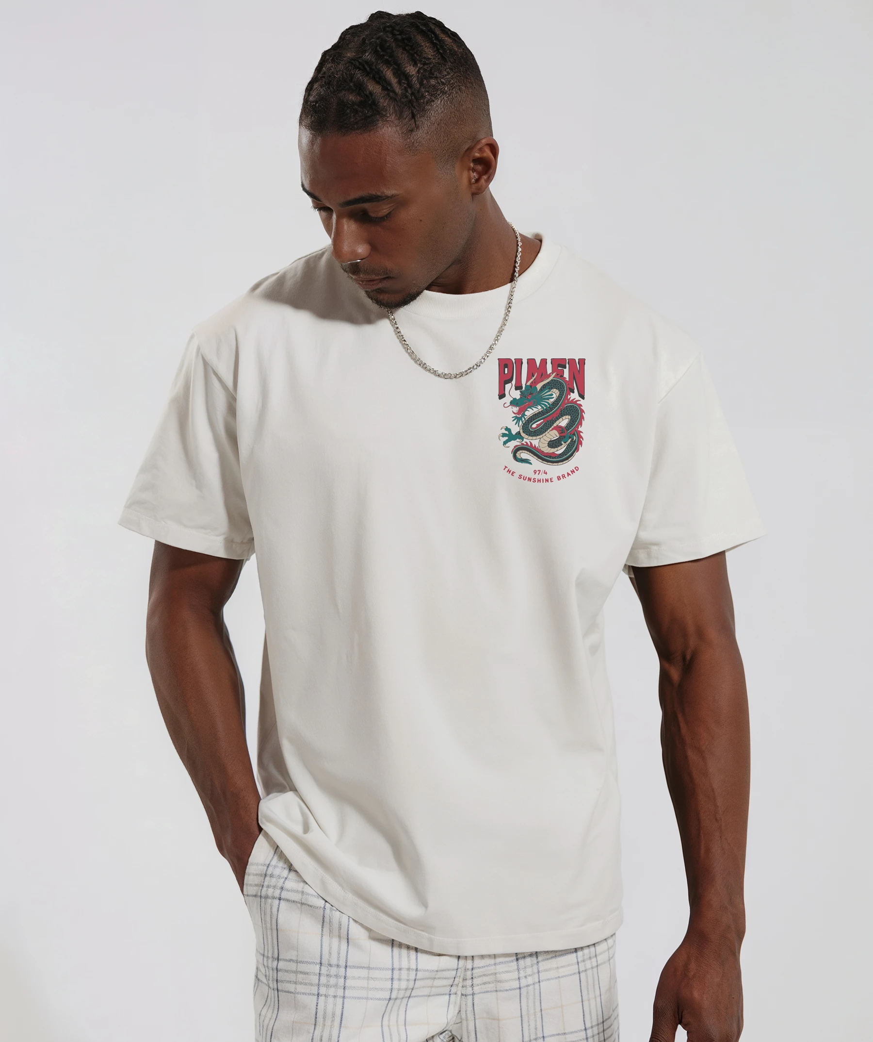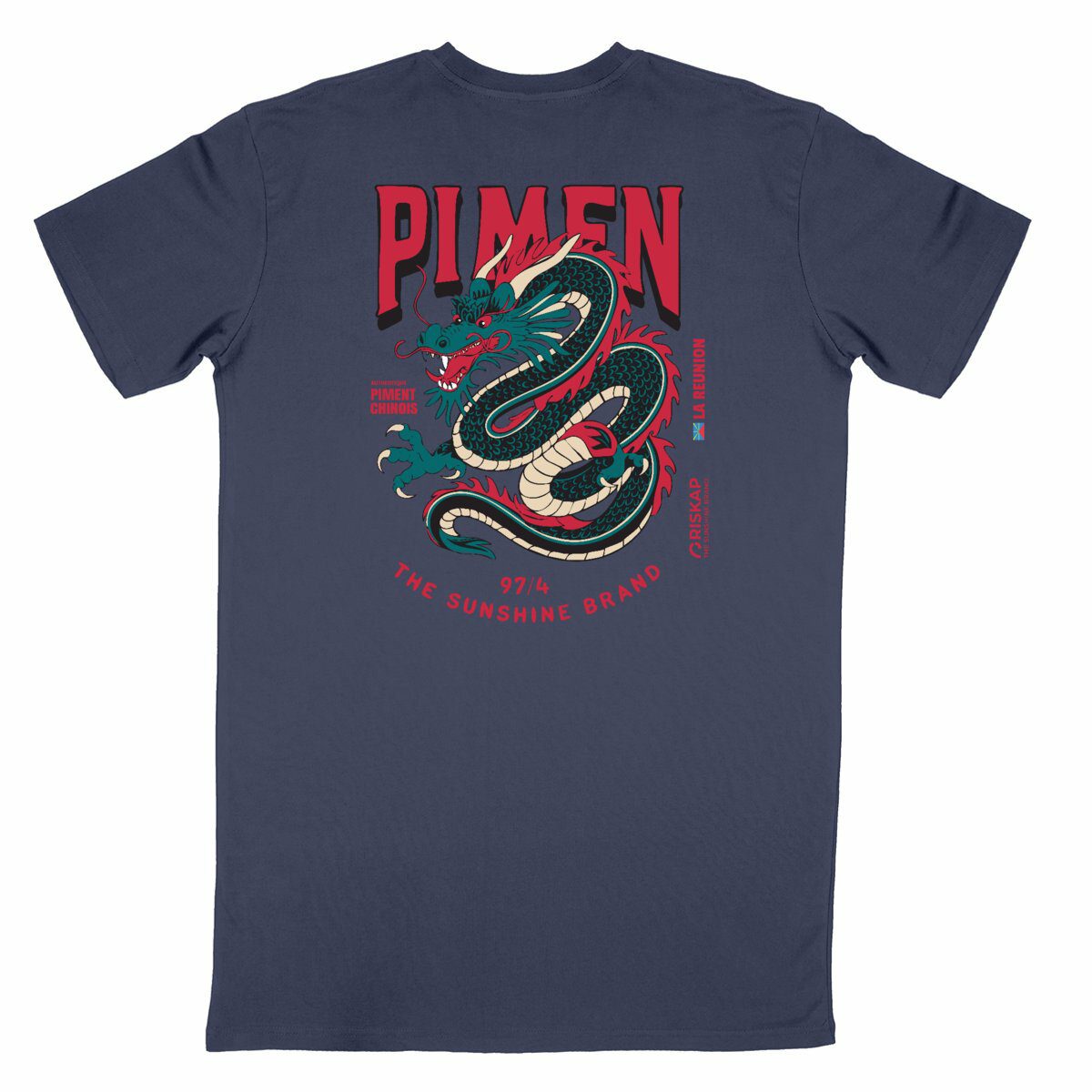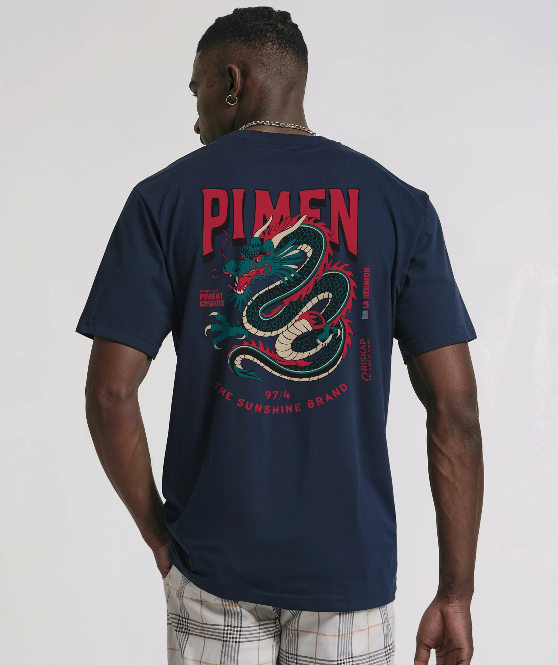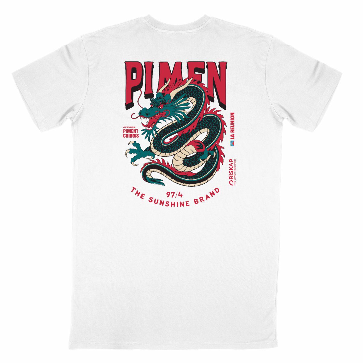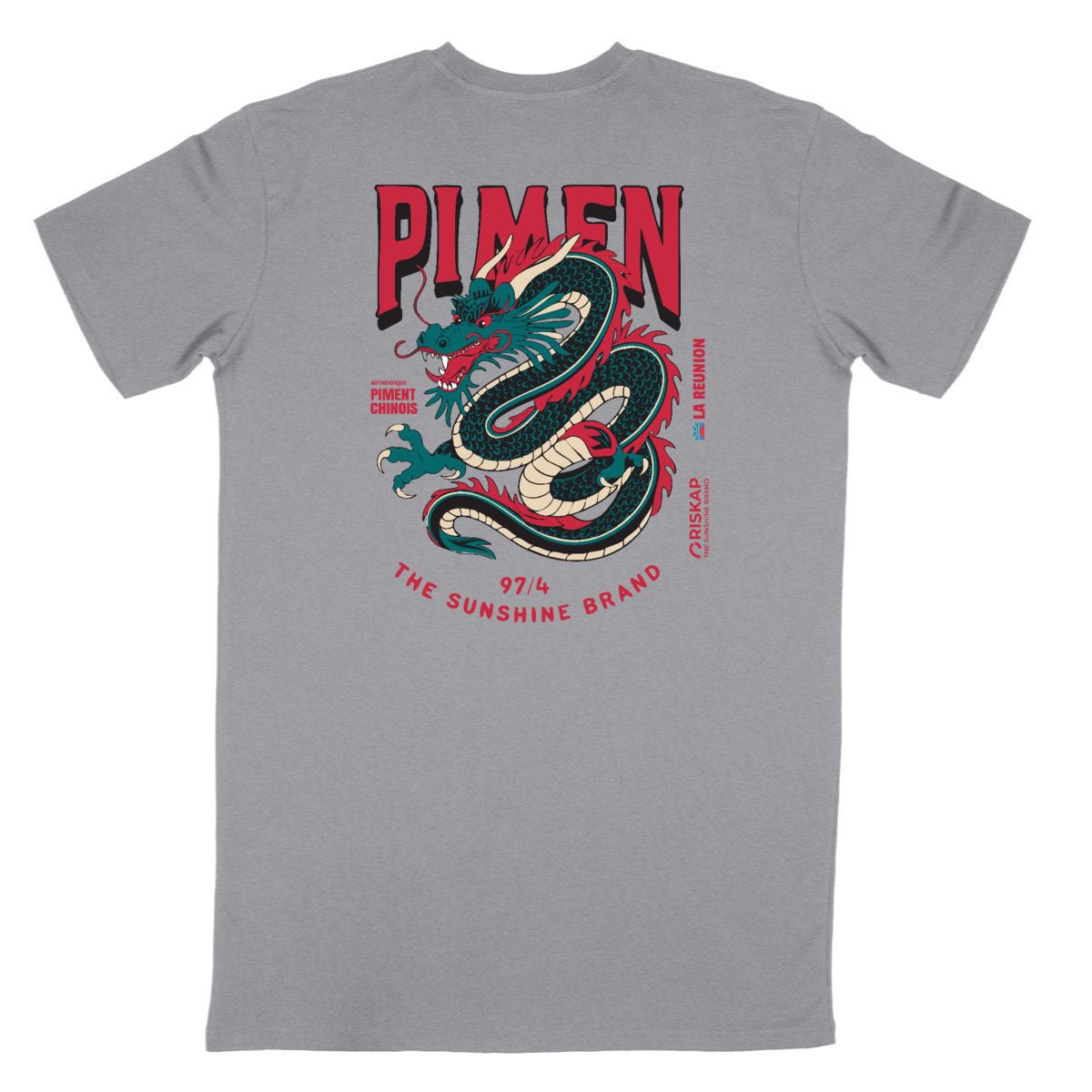 Ce t-shirt homme arbore fièrement le design « Pimen », mettant en avant un dragon stylisé associé au piment chinois, souvent utilisé sur l’île de la Réunion. Ce motif vibrant et unique apporte une touche exotique et épicée à votre garde-robe.