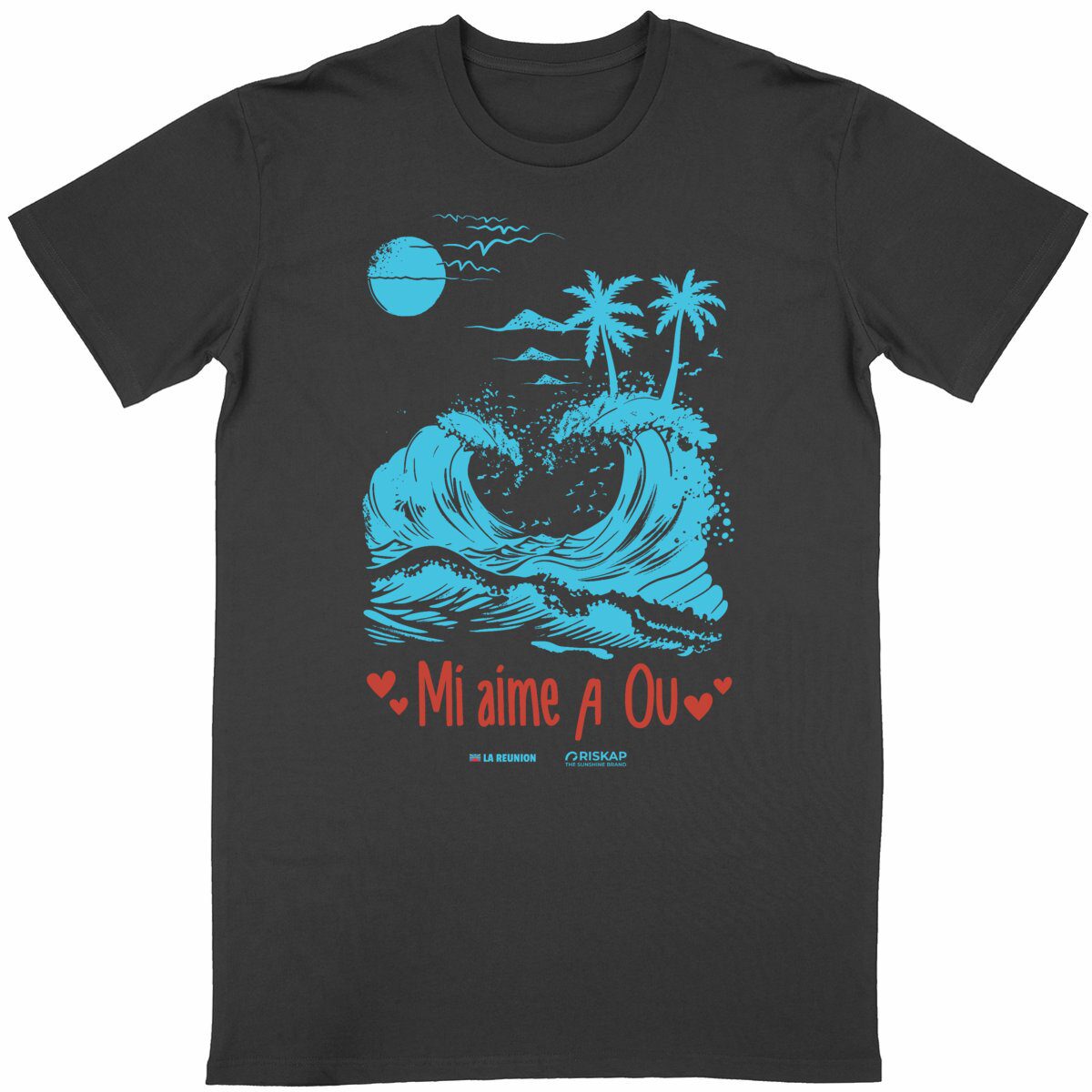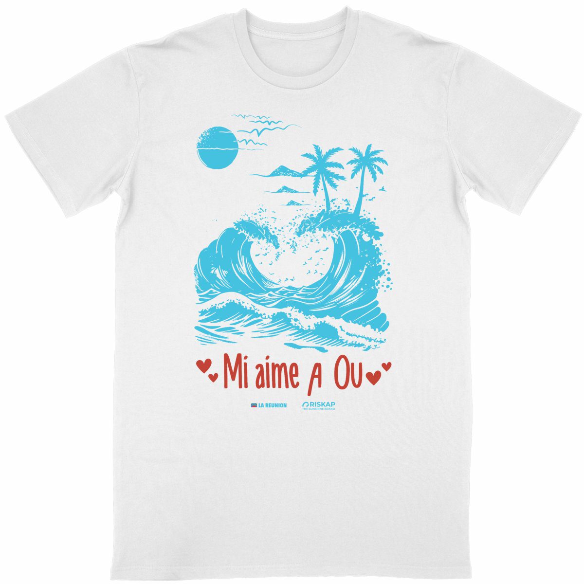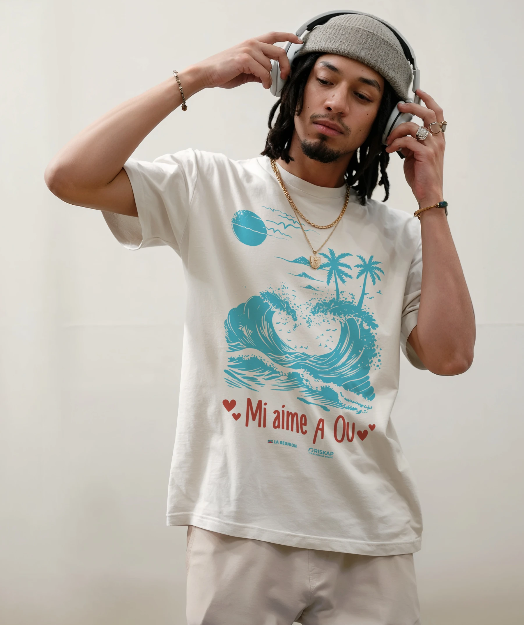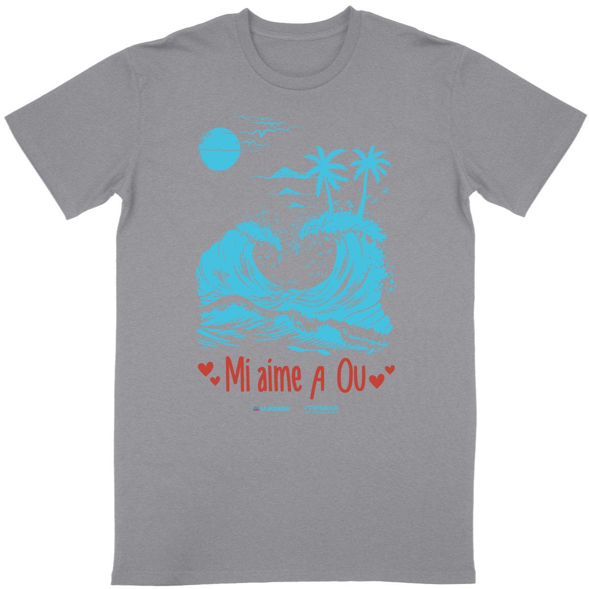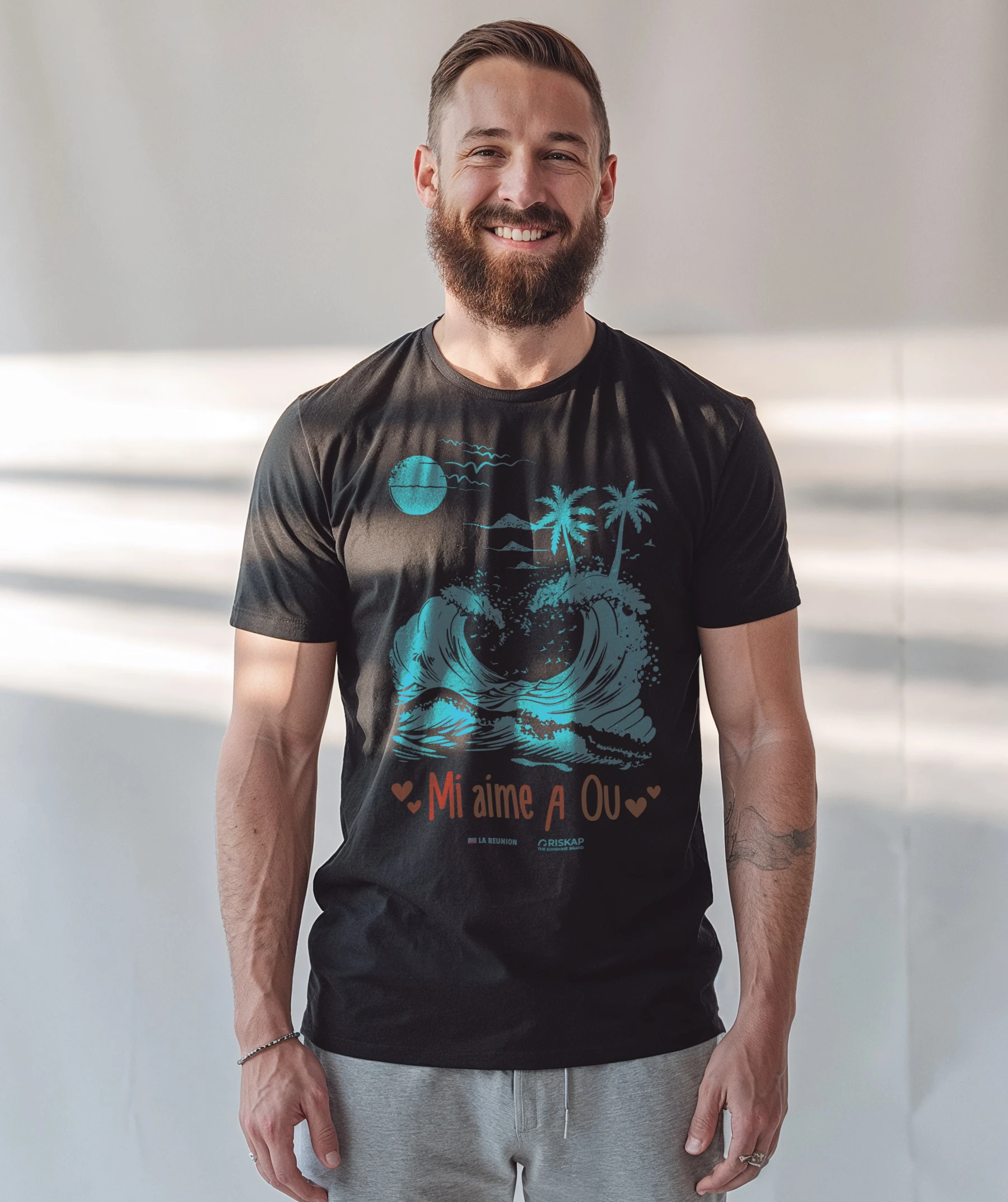 T-shirt Homme – Vagues Coeur – Célébrez l’amour avec ce T-shirt unique en coton bio, illustré par des vagues et un cœur avec l’inscription ‘Mi aime a ou’. Un cadeau parfait pour montrer votre affection et votre appréciation.
