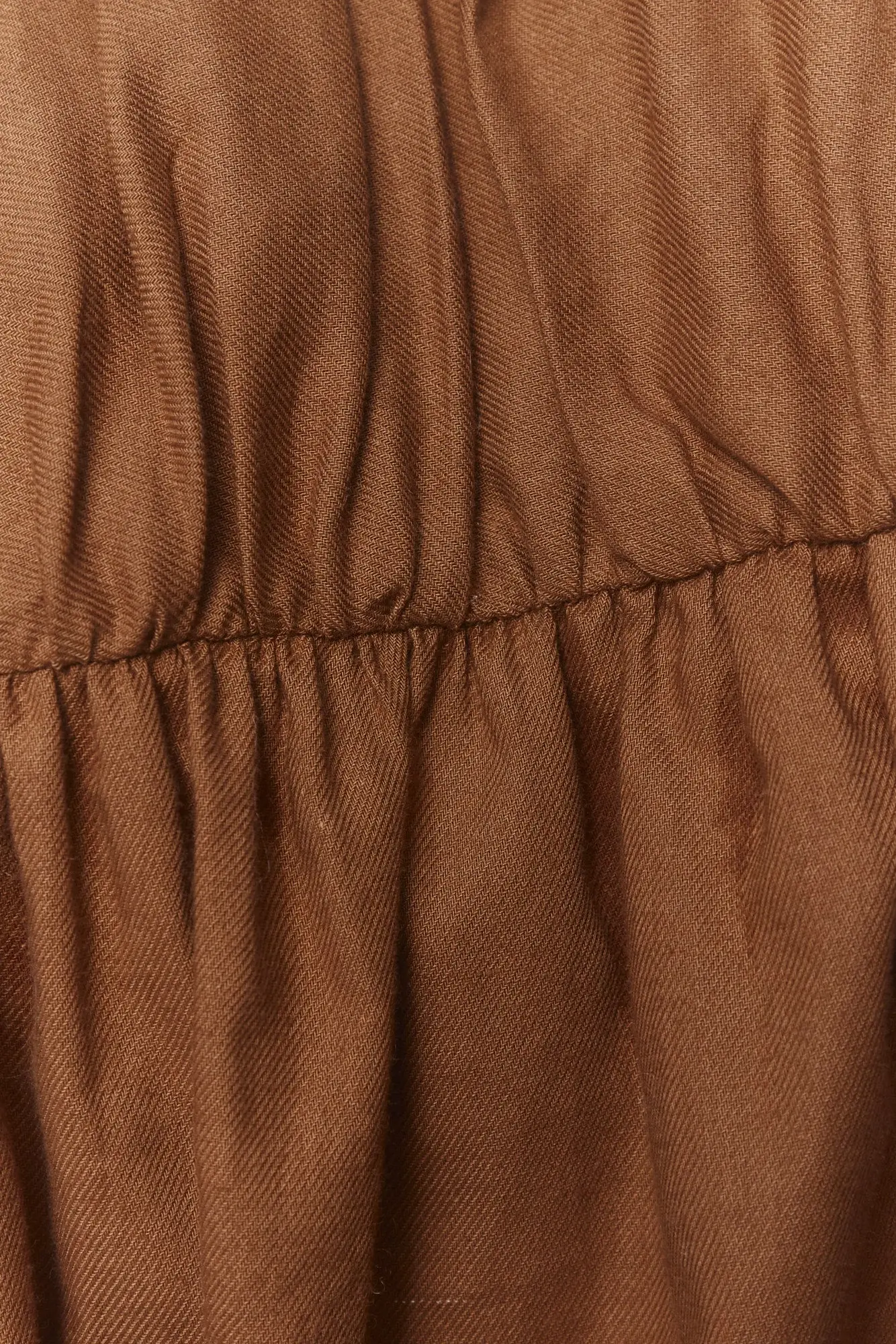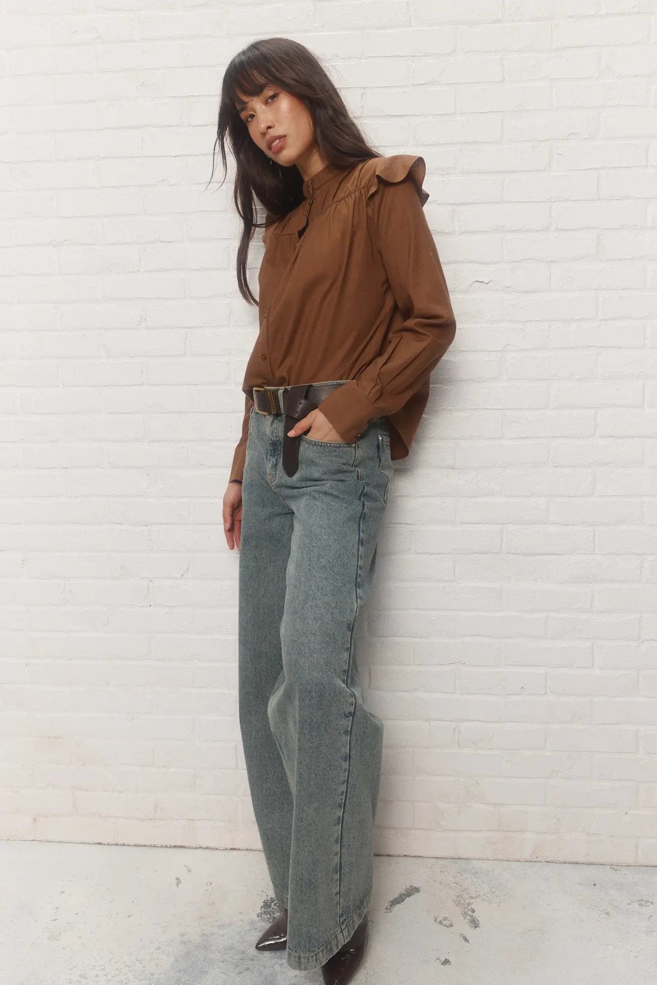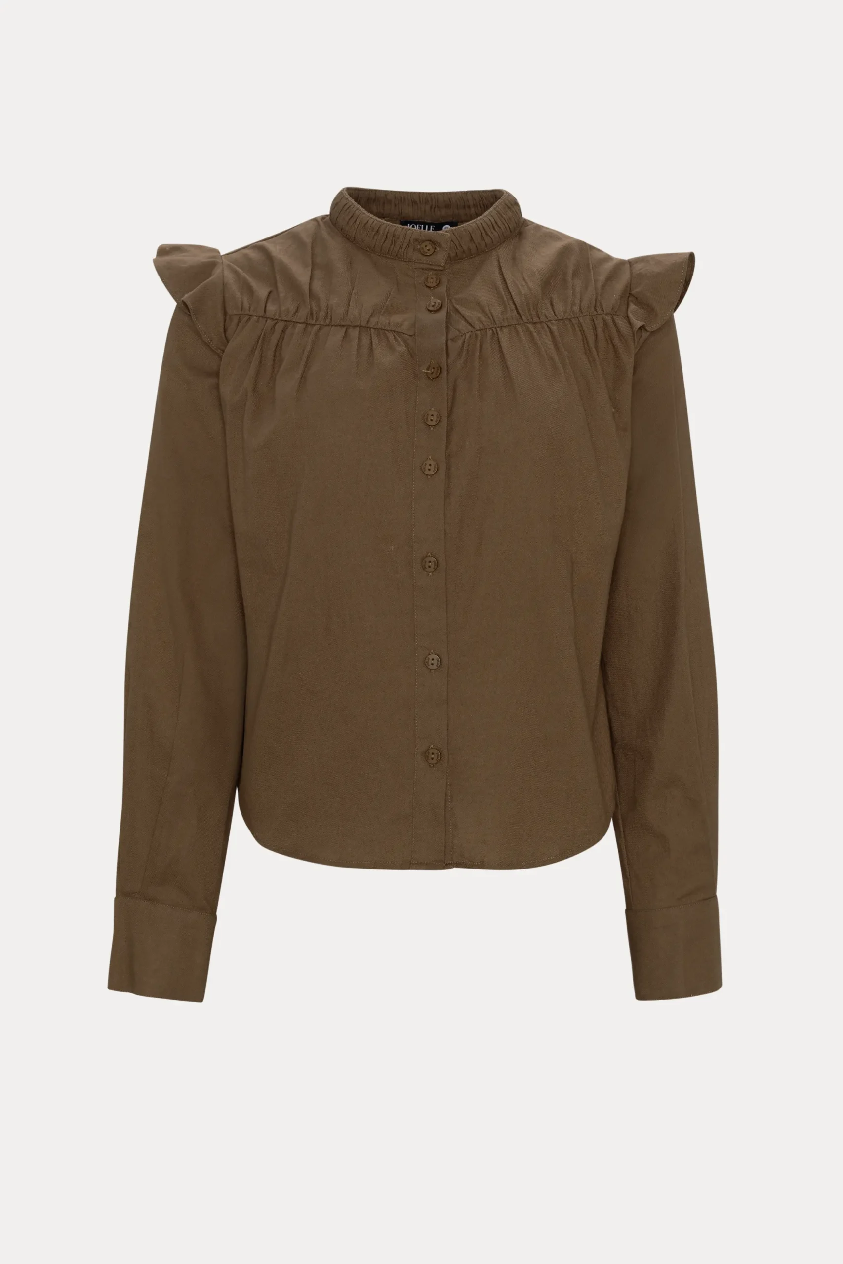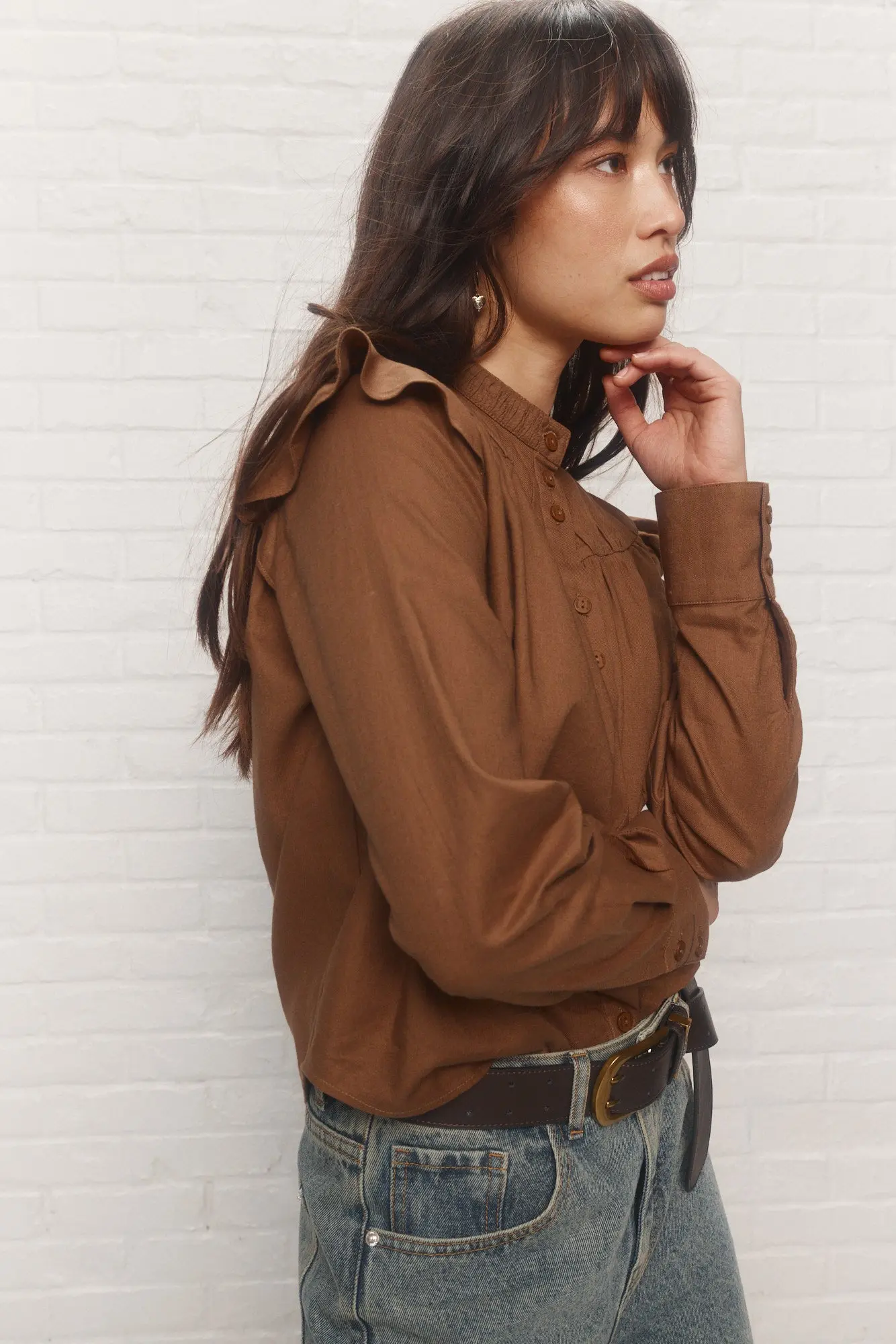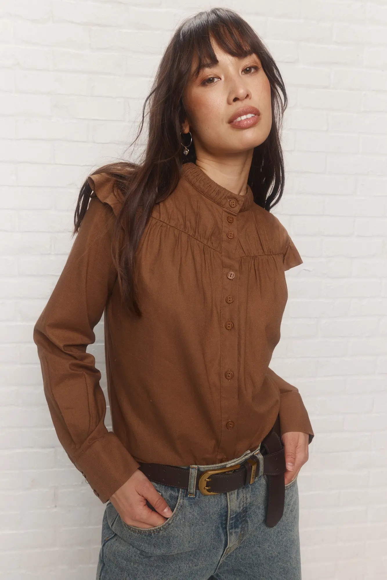 D’inspiration western, voici la chemise brune à manches longues Tamago. Les volants créent une silhouette structurée et accentuent les épaules. Des fronces au col officier, vous avez là une création unique.