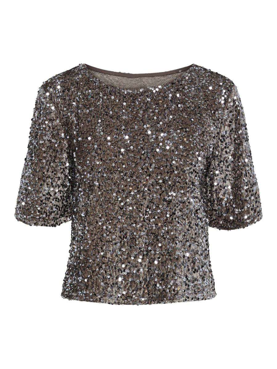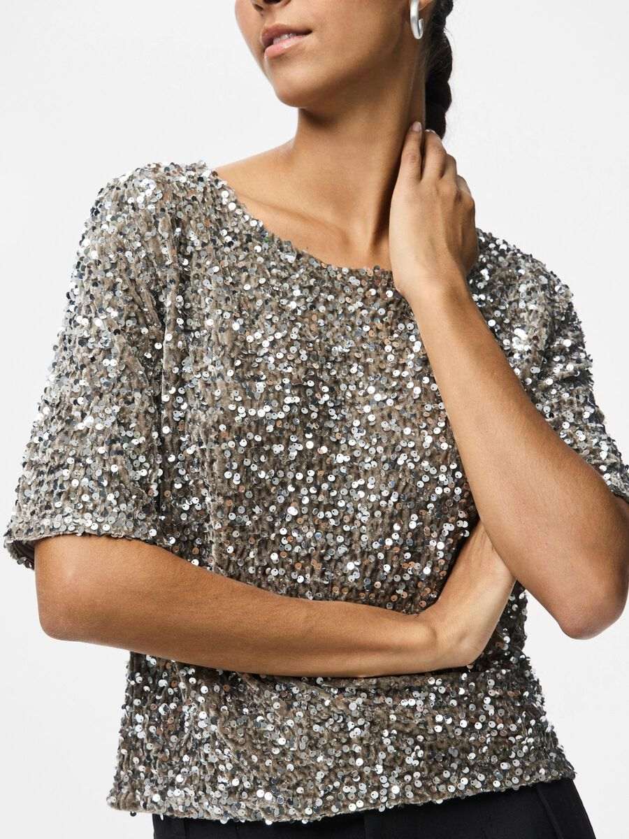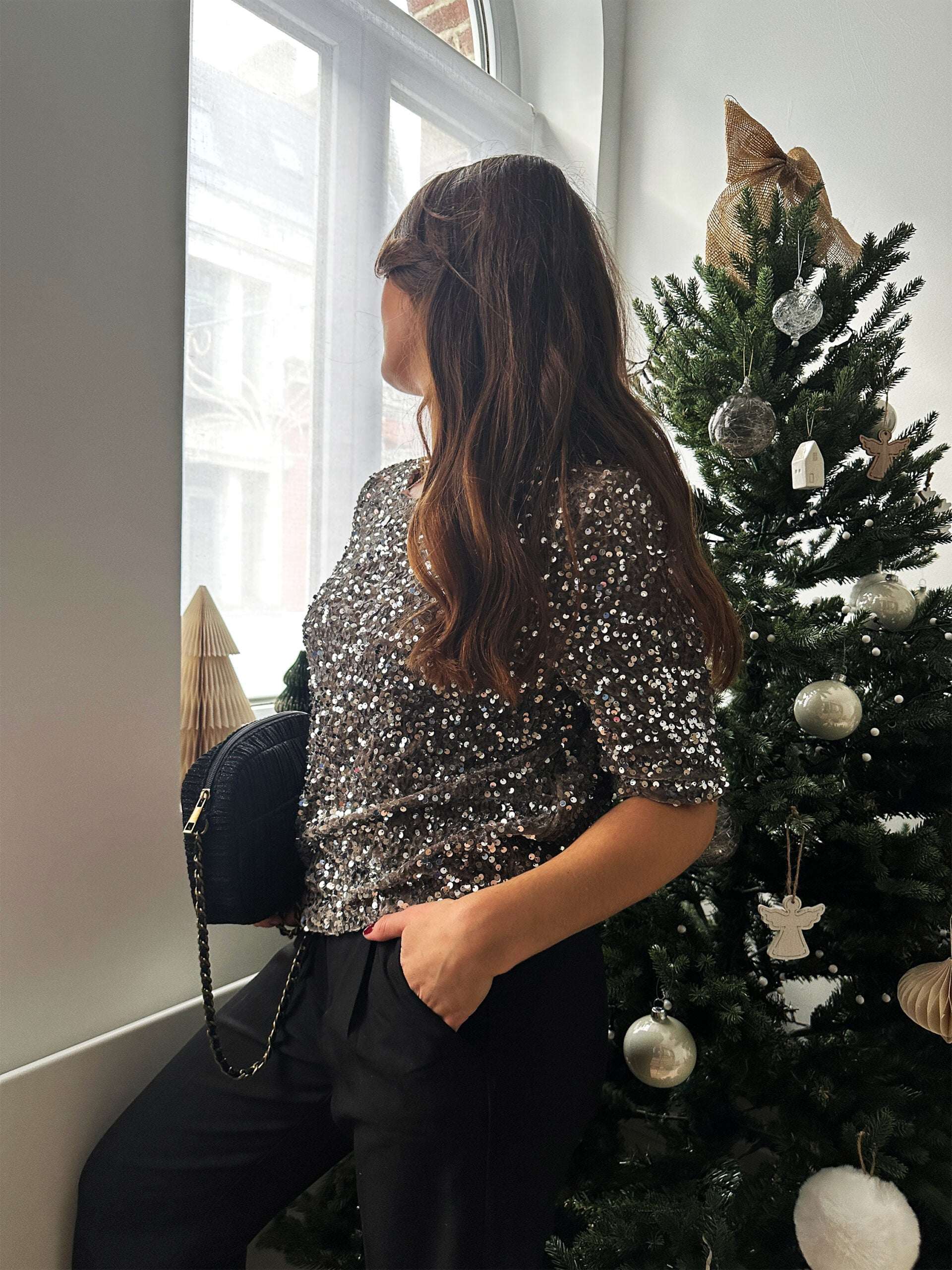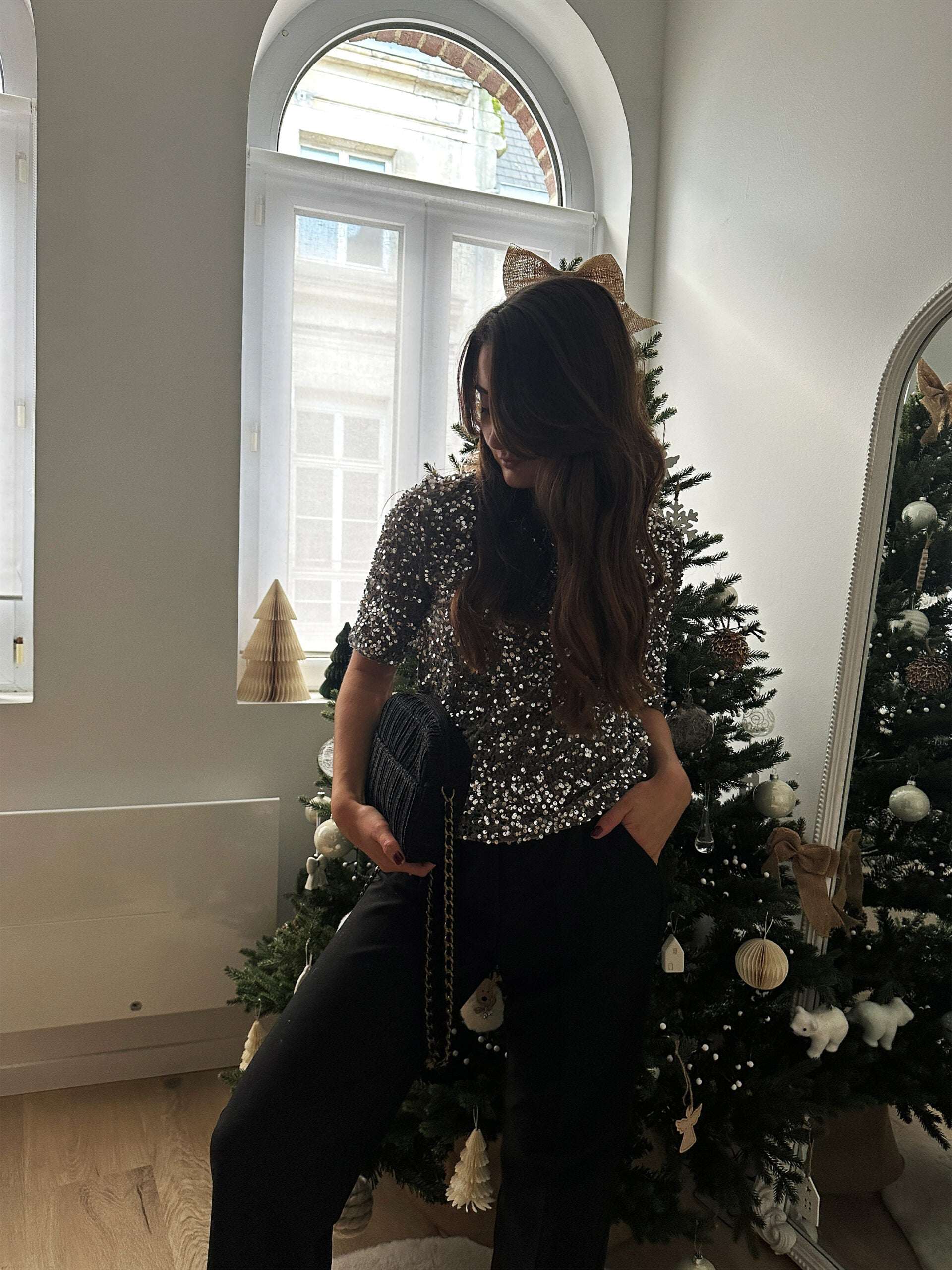 Faites briller vos soirées avec le T-shirt STELLA, la pièce incontournable pour illuminer vos looks de fête. Entièrement recouvert de sequins argentés !