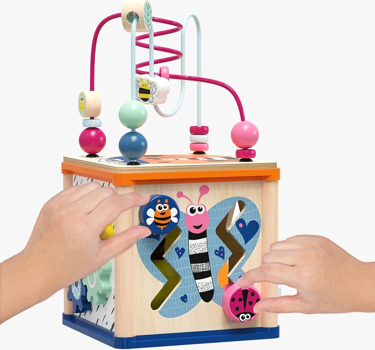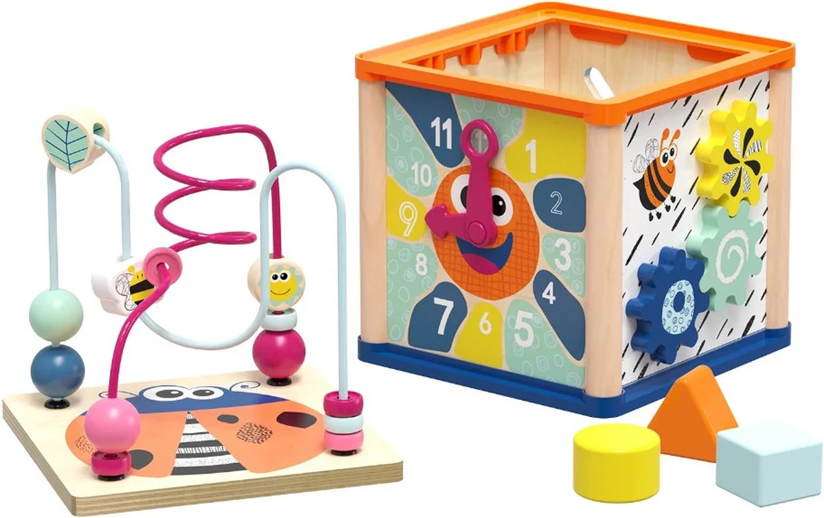 De activiteitenkubus bestaat uit vijf zijdes vol speelplezier, elk met een uniek element zoals een klok met bewegende wijzers, tandwieltjes, een vormenstoof en een schattig vlindertje. Aan de bovenkant bevindt zich een uitneembaar kralenlabyrint, dat apart gebruikt kan worden. Alle blokken van de vormenstoof kunnen handig binnenin de kubus worden opgeborgen.