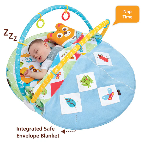Het extra gevoerde speelkleed met bogen Play n Nap van Yookidoo is speciaal gemaakt voor de kindjes die snel in slaap vallen bij het spelen of erg onrustig zijn. Door het aan het speelkleed vastzittende dekentje dek je je kindje snel en lekker warm toe. Bovendien kan in de enthousiastme van je kindje deze het dekentjes niet van zich af trappelen.