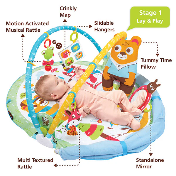 Het speelkleed heeft diverse leuke speeltjes met ieder hun eigen kleurtjes, textuur, en sommige zelfs met geluid. Een vrolijke spiegel, een kussen voor als je je kindje op zijn buik legt, en een muziekrammelaar. De bogen van het speelkleed zijn verstelbaar zodat je kindje in elke leeftijdsfase bij de speeltjes kan.