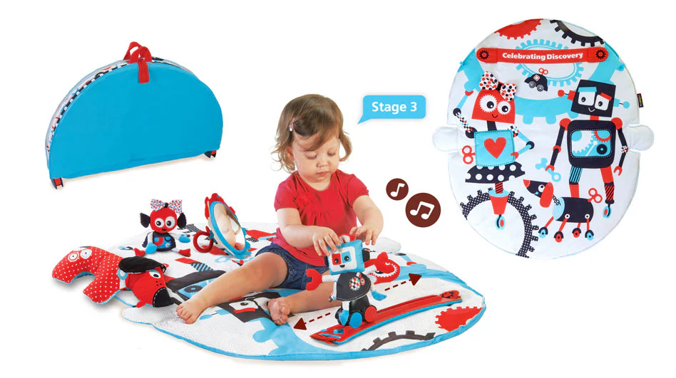 De speelkleed Gymotion Robo Playland is speciaal ontworpen voor kleintjes tijdens de buik tijd. Het speelkleed speelt 10 minuten achtereenvolgend de melodie af. Ook zit er een stille modus op. De speelkleed is gemakkelijk op te vouwen tot een roll-n-go draagtas met een verborgen vak om extra accessoires op te bergen. Geschikt voor kinderen van 0 tot 12 maanden.